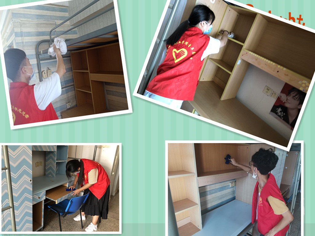 志愿者们带着清洁工具来到新生宿舍,有条不紊地进行着打扫工作。大家不怕脏不嫌累,通力协作,从擦拭桌椅、衣柜、到清洁地面等,不留下任何一个死角。他们积极投入到宿舍清洁工作中,热火朝天地忙碌着。
