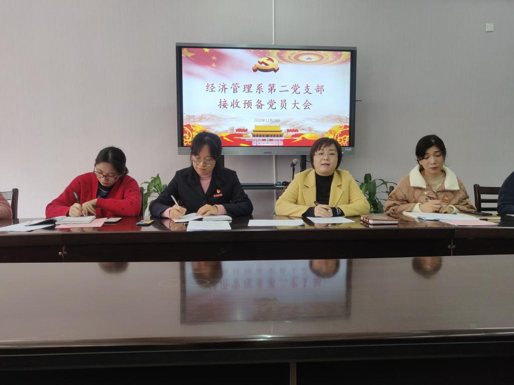 2020年12月24日上午,经济管理系第二党支部在系会议室召开接收预备党员大会,支部6名正式党员和25名发展对象共31人参加会议,第二党支部书记陈玉婷主持会议。